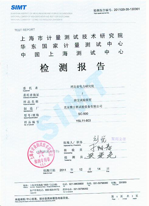 砂塵試驗箱檢測報告-上海計量院-河北電科院