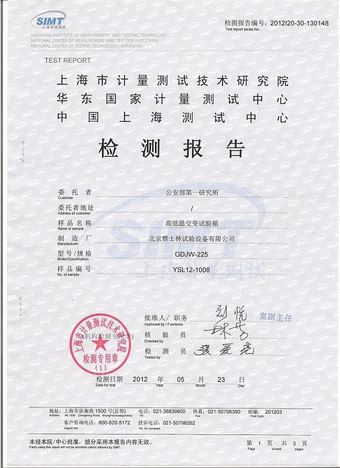 >>高低溫交變試驗箱檢測報告-上海計量院-公安部