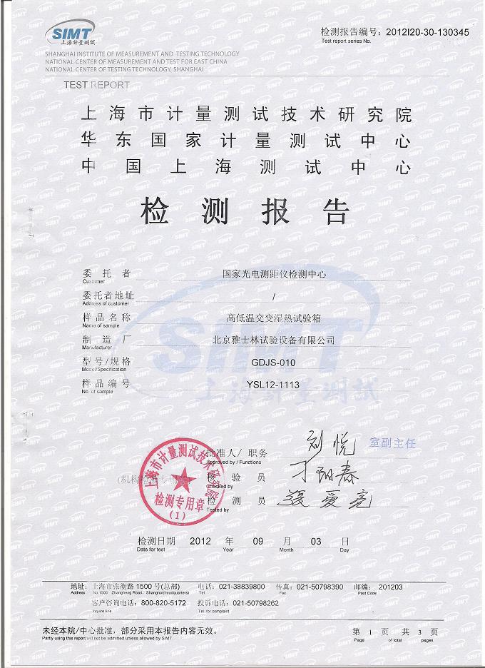 高低溫交變濕熱試驗箱檢測報告-上海計量院-國家光電檢測