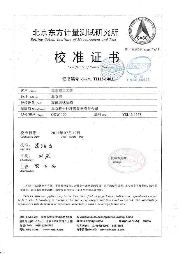 >>高低溫試驗箱校準證書模板下載—北京東方計量所