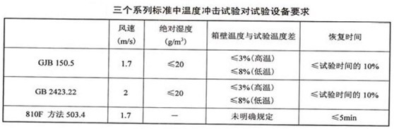 下表中列出了三個系列標準中溫度沖擊試驗對試驗箱的要求,由于都是屬于溫度試驗的范疇,因此其對溫度沖擊試驗箱的要求與溫度試驗箱的要求類似,其主要區(qū)別是增加了溫度沖擊試驗中開箱放入試驗樣品后試驗箱內(nèi)空氣溫度恢復到規(guī)定試驗溫度的時間要求。